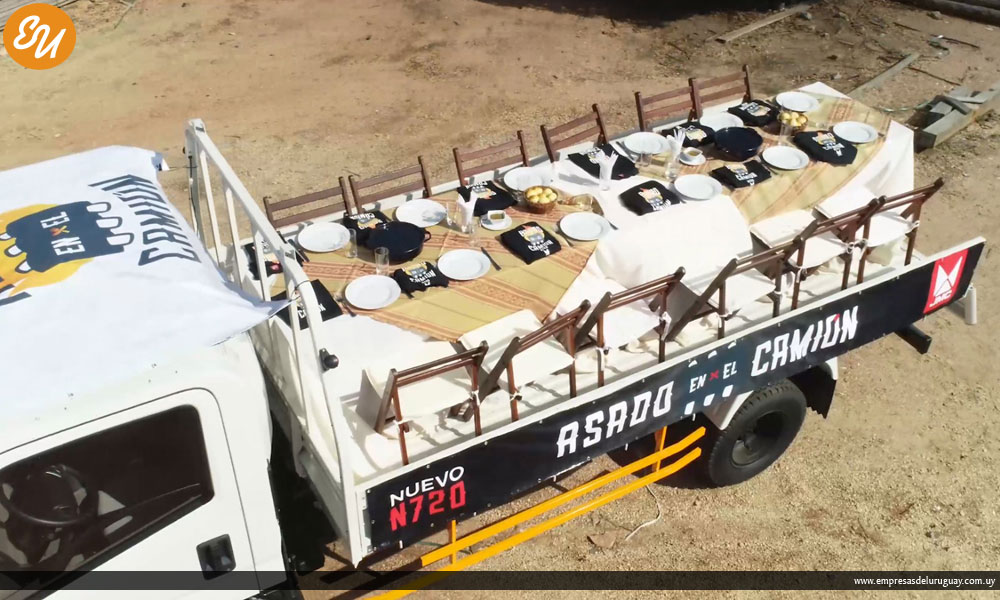Los trabajadores de Barraca Paraná, que debieron registrar previamente sus datos en la fanpage de Facebook de JMC, compartieron un asado servido en la caja del nuevo modelo N720, que fue adaptada para transformarse en un original comedor.