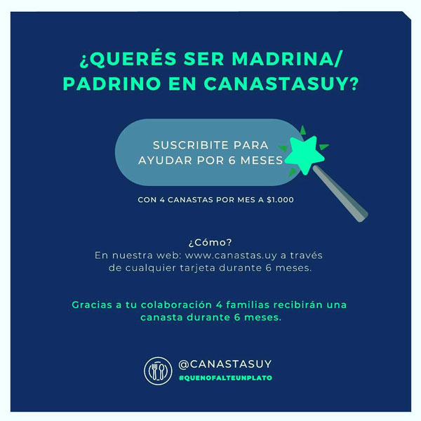 La iniciativa @CanastasUy, que recibe donaciones de empresas y particulares para armar canastas con alimentos de primera necesidad que se destinan a las localidades y organizaciones más vulnerables de varios departamentos del país, lanzó un sistema de padrinazgo que ofrece la posibilidad de donar $1000 pesos por mes para ayudar a 4 familias.