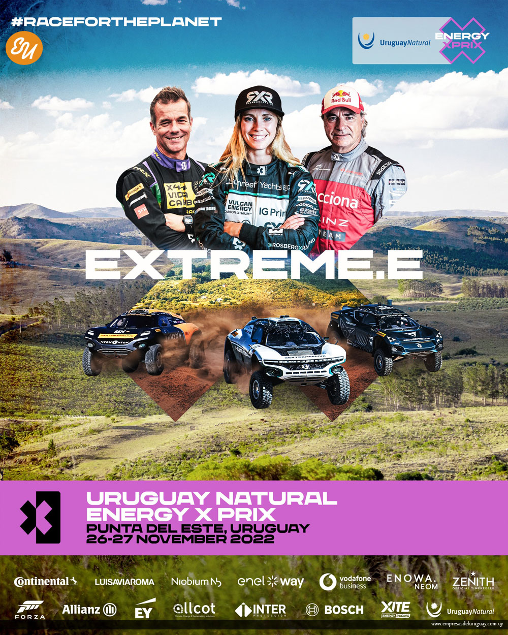 El Uruguay Natural Energy X Prix de Extreme E mostrará cómo Uruguay, como país, está asumiendo un compromiso líder en el mundo en sus esfuerzos por cambiar a las energías renovables, estableciendo un punto de referencia sobre cómo se pueden adoptar estas lecciones. Es fantástico ver que deportes como Extreme E adoptan mensajes cruciales y con propósito en su misión, y me complace apoyar la serie con estos esfuerzos“.