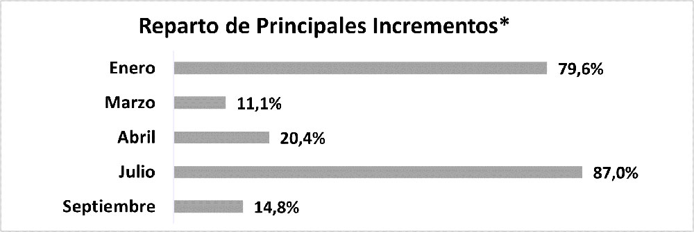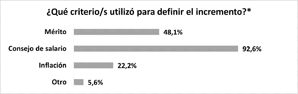 Los principales meses de otorgamiento de incrementos fueron enero, julio y abril. Respecto a los criterios utilizados para definir los incrementos, en mayor medida son el Consejo del Salario (92,6%), seguido por el mérito (48,1%) y la inflación (22,2%).