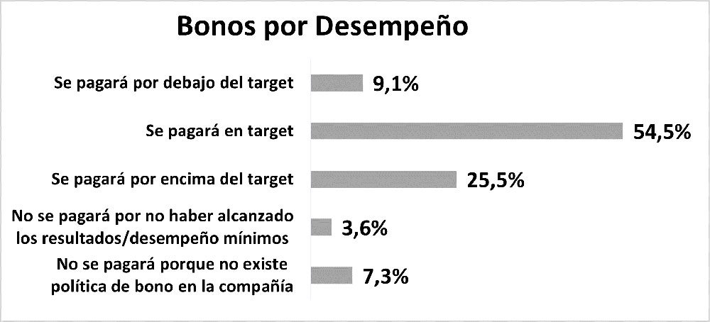 En relación a los bonos por desempeño, el 54,5% de las empresas prevé que se pagará en target, el 25,5% prevé que se pagará por encima del target y el 9,1% planea pagar por debajo.