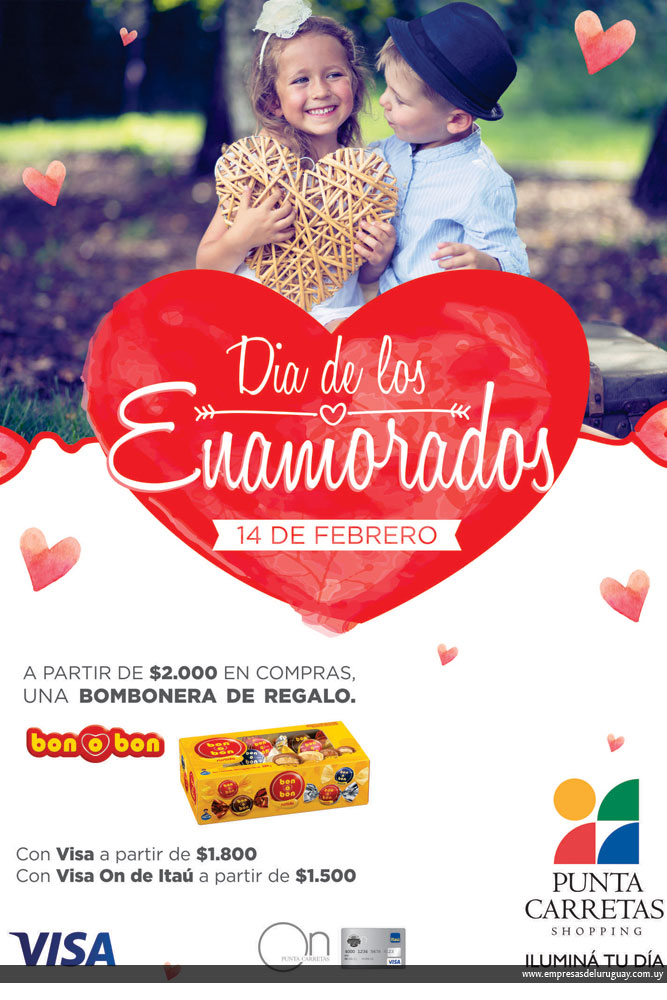 Del 3 al 14 de febrero o hasta agotar stock, presentando boletas de compras superiores a $ 2.000 se podrá retirar en forma gratuita una caja de bombones surtidos en el stand de Atención al Cliente, ubicado en el segundo nivel del shopping. Si se utilizan como medio de pago tarjetas del sello Visa, la bombonera se entregará a partir de $ 1.800 en boletas, y desde $ 1.500 en facturas si se usa la tarjeta Visa On Punta Carretas de Itaú.