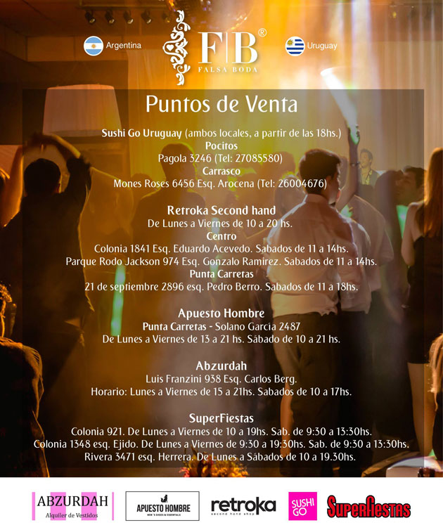 Falsa Boda se ha desarrollado con éxito en importantes ciudades de Argentina y Paraguay, ofreciendo una calidad de servicio superior, que incluye la participación de marcas de prestigio, como Samsung, Miller, Chandon y Sushi Go. En esta oportunidad, también participarán Jameson, Chivas Regal, Absolut, Havana Club, Fernet Branca, Gancia, New Age, Chellato, Mvd Grupo Bar, SuperFiestas, Radisson, Gallery, Sound & Lighting, y SEVEN, entre otras.