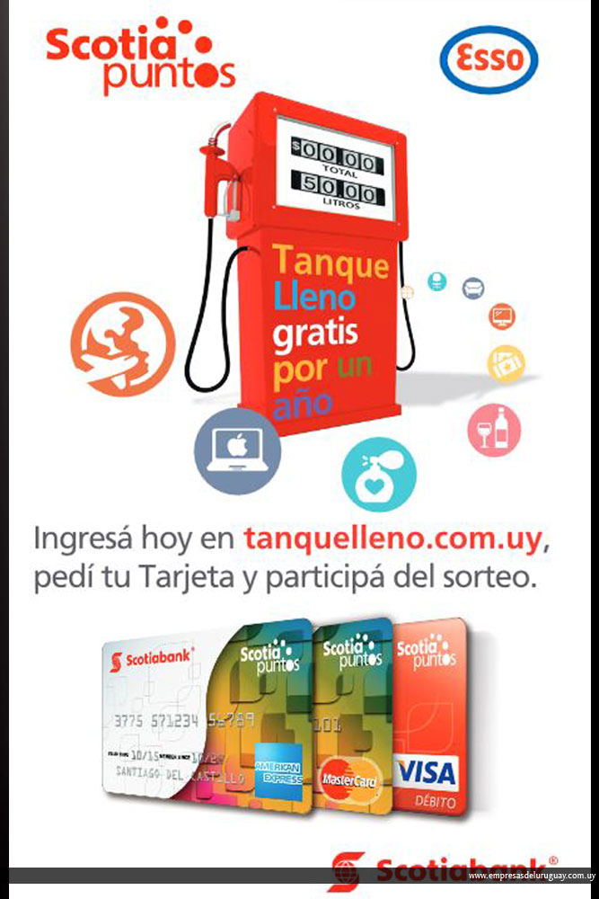 Todas las personas interesadas en Scotia Puntos deberán ingresar a www.tanquelleno.com.uy  y completar un formulario con el código que recibirán en cualquiera de las 68 estaciones ESSO adheridas; una vez ingresada la solicitud, estará participando del sorteo por las 4 órdenes de compra de combustible gratis durante un año, de acuerdo a las bases de la promoción. El sorteo se realizará el 17 de agosto de 2016 en Casa Central de Scotiabank Uruguay, bajo la supervisión de escribano público.