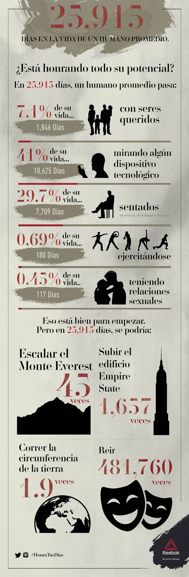 Por medio de un estudio realizado en colaboración con la consultora global Censuswide, el cual se enfocó en las actividades más comunes practicadas en nueve países diferentes, Reebok ha descubierto que mientras 41 por ciento de nuestro tiempo en vida se nos va mirando algún dispositivo electrónico (smartphone, tablet, laptop y otros), sólo destinamos 0.69 por ciento del resto para ejercitarnos, es decir, apenas 180 días frente a los 10,625 que perdemos mirando pantallas.