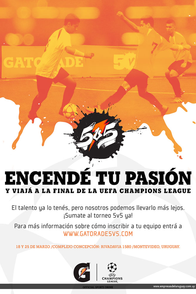 5v5 GATORADE® es el nombre del torneo interna-cional que llega a Uruguay y que permitirá por primera vez a equipos locales participar de este evento, que se llevará a cabo 18 y 25 de marzo y  que premia a los ganadores con invitaciones VIP para ver la gran final de la UEFA Cham-pions League de este año en Gales.