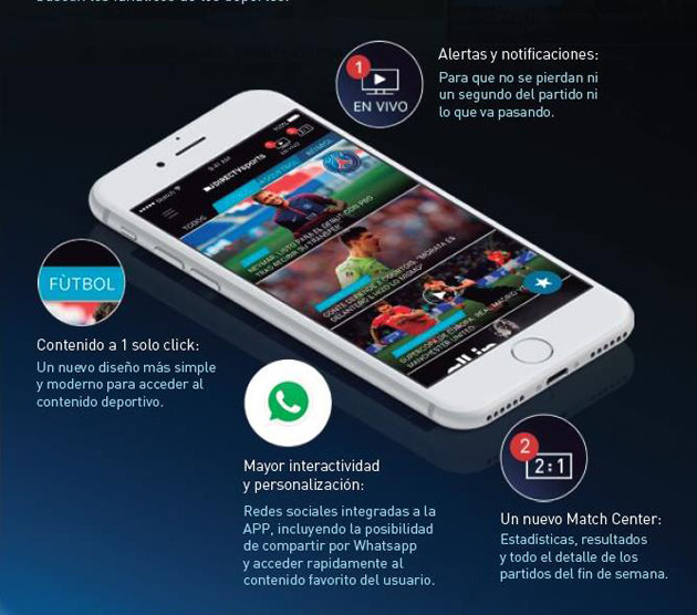 Un diseño más simple y moderno presenta la nueva version de DIRECTV Sports App, entregando al usuario mayor interactividad y personalización de contenidos favoritos, los cuales ahora también se pueden compartir por WhatsApp. Un menú amigable e intuitivo permite con un simple clic una selección rápida y directa.