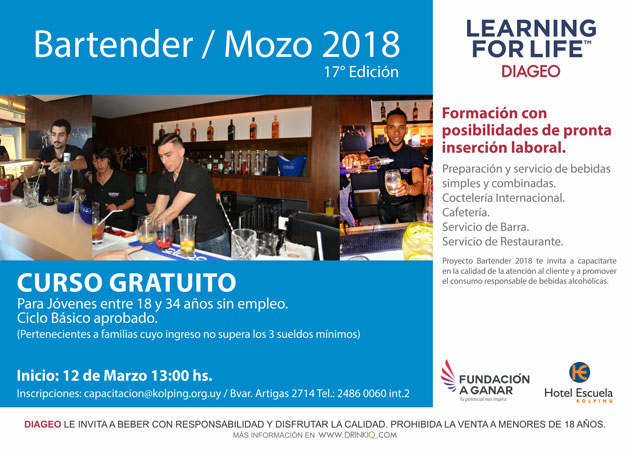 Continuando con su compromiso de brindar herramientas para la educación y la inserción laboral en Uruguay, DIAGEO lanza el próximo 12 de marzo un nuevo curso de Bartender/Mozo, en el marco de la 17ª edición del Programa de Responsabilidad Social Empresarial/Sustentabilidad “Learning for Life” (aprendiendo para la vida).