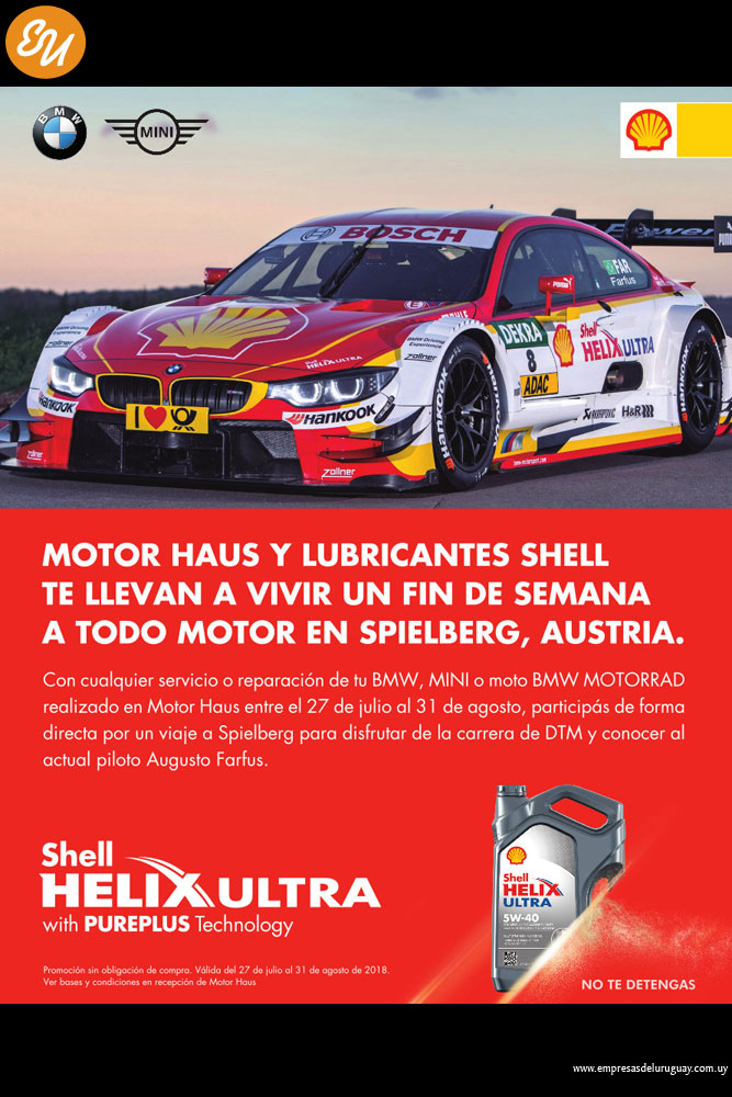 Desde el 27 de julio y durante todo agosto, quienes lleven su BMW, MINI o BMW Motorrad a realizar servicios en Motor Haus Sede Central o Carrasco, participan de un sorteo por un viaje a Spielberg, Austria, para disfrutar de la carrera de DTM que se lleva a cabo en esa ciudad y para conocer al piloto Augusto Farfus.
